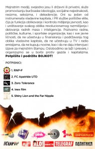 RNP-F : Kao što možete pročitati u proglasu. Znate da sumejnstrim mediji finasirani od strane države i krupnog kapitala, i da služe kao instrument kontrole mišljenja i svakog subverzivnog političkog i kulturnog delovanja. U imperijalističkim centrima, poput SAD, Britanije ili Francuske, oni između ostalog, kao što ste prošle nedelje mogli zaključiti, služe i za građenje popularne podrške za neokolonijalne projekte, a kod nas za popularizaciju privatnih inicijativa, ekstremnu liberalizaciju tržišta, mere štednje, evropske integracije itd…Dakle za sticanje podrške kvislinške politike kojom se dovodimo u poziciju kolonije, za širenje i doziranje međunacionalne mržnje ili pak tolerancije po potrebi, za pravdanje sve većih socijalnih razlika, za kulturni rasizam prema Romima, ili narodima trećeg sveta itd…Šta je suština bojkota?
